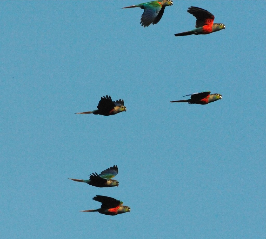 The fourth most viewed photo is of a noisy flock of Crimson-bellied parakeets (477 views) photographed from a canoe as they flew across the Amazon river .